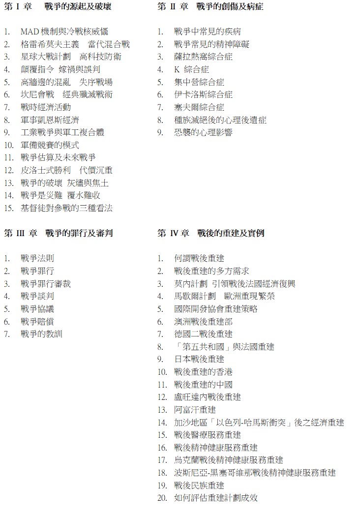 《戰爭前後:破壞與重建》分為四大部分,包括「戰爭的源起及破壞」、「戰爭的創傷及病症」、「戰爭的罪行及審判」及「戰後的重建及實例」,共51篇文章。本書以跨學科視角,以冷靜理性與人文關懷並重的筆觸,縱橫古今戰事,剖析戰爭如何在認知、科技與制度上擴張並反噬文明。