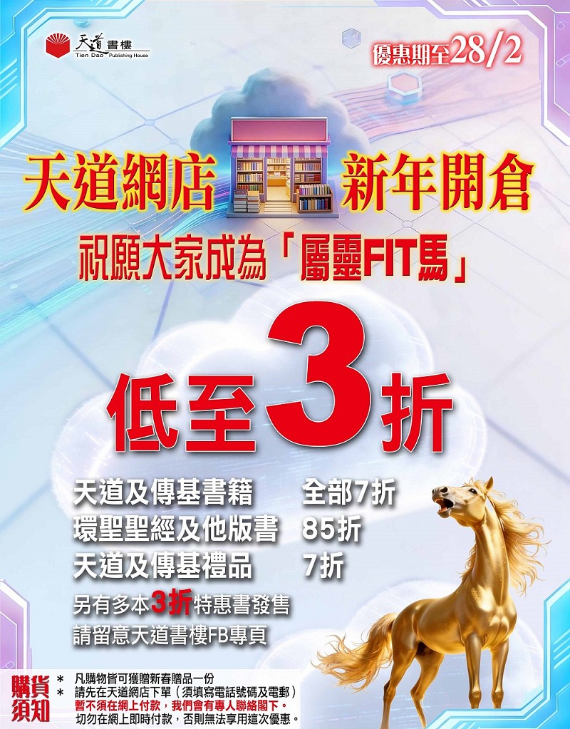 天道網店今年2月將會首度開倉,提供低至3折的優惠,讓你足不出戶,就可購買合適的書籍和禮品。而且,購物折實滿HK$1000,更可享免費送貨服務(只限香港本地,離島及偏遠地區除外)。詳情見下: